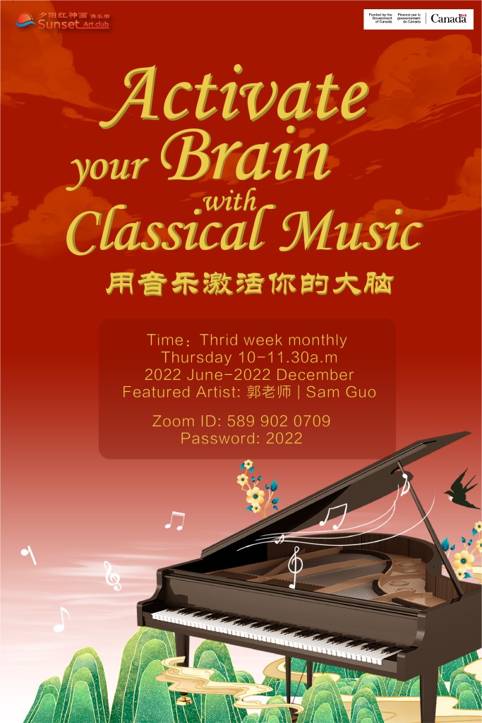 夕阳红俱乐部特邀郭老师(Sam Guo)为大家介绍中西音乐史:西洋乐,民族乐,艺术歌曲,合唱, 民歌等。梁祝,黄河,中外著名曲目(独奏、重奏和协奏曲)。