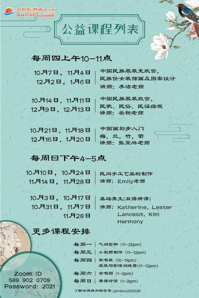 中英双语学习中国民族服装史,民歌、民谣、民俗、及手工配饰(绣荷包,扇面,中国结等)、鞠球、旗袍纽扣制作。中国仕女图临摹、中国国画入门,汇报展及拍摄。